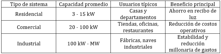 Cada cliente tiene necesidades diferentes, y por eso los sistemas solares deben adaptarse a la magnitud de su consumo. Un hogar busca reducir su recibo de luz, un negocio necesita disminuir costos fijos y proyectar una imagen verde, mientras que una industria requiere estabilidad energética y ahorro en operaciones de gran escala.